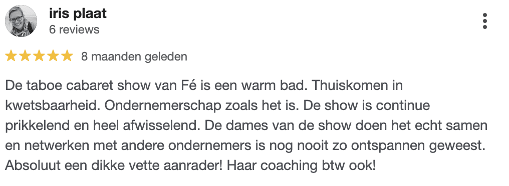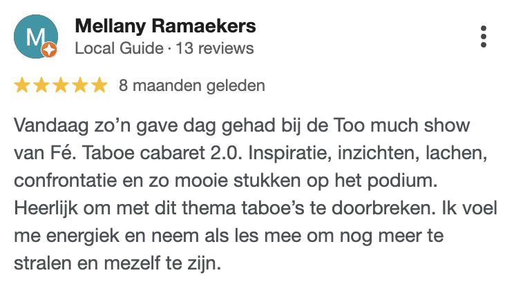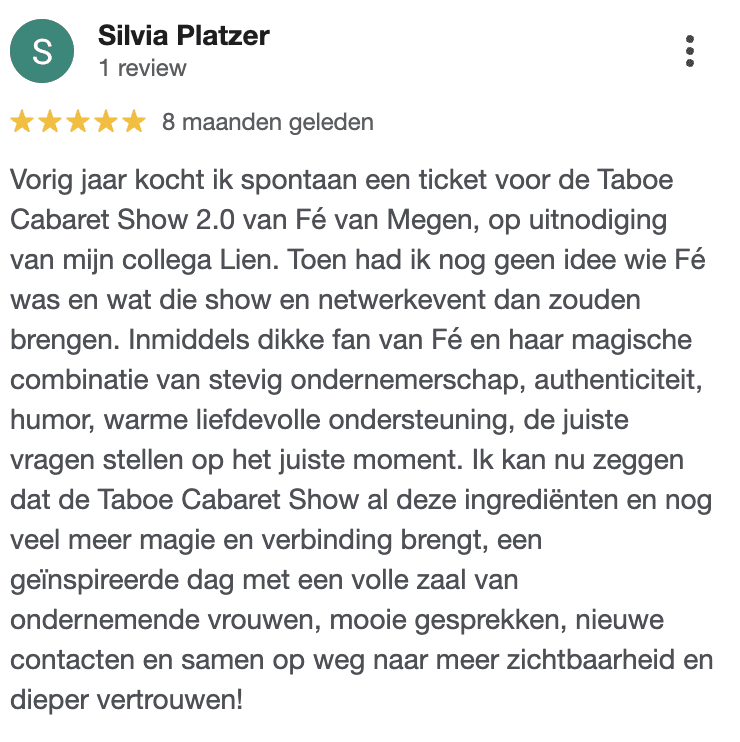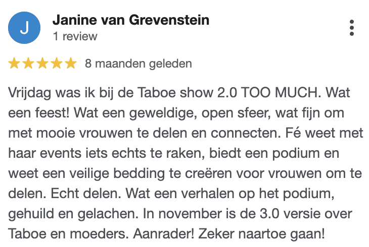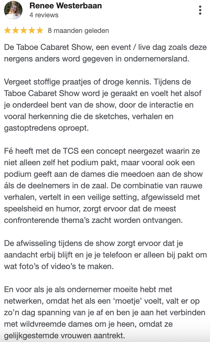 Waar je ook staat op je ondernemersreis (van 0-100K per maand) of moederschap (van zwanger tot kids al uit huis) je gaat je onderdompelen in een Show vol herkenning, een lach en een traan en prachtige spiegel.
