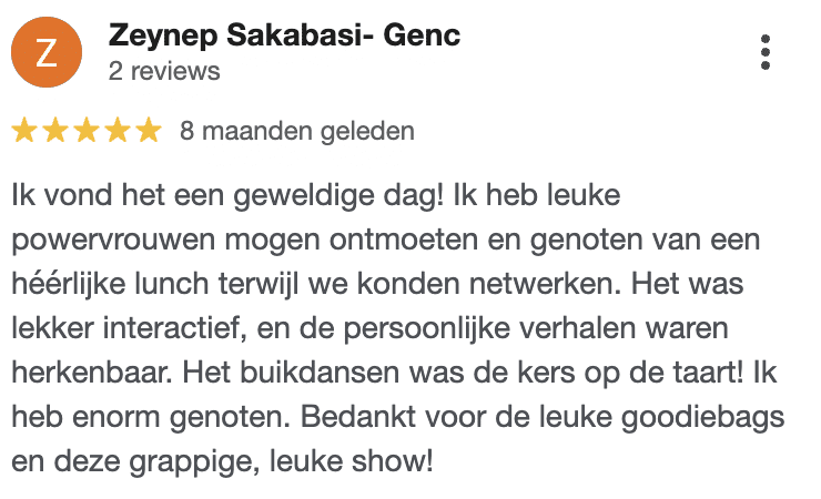 Ik weet hoe spannend een event kan zijn. Ik heb er zelf ook gestaan. Ik ging met klotsende oksels van het zweet naar events. Dit is daarom ook de reden waarom je direct wordt opgevangen door onze gastvrouwen en we je koppelen aan iemand die ook alleen is. Niet ‘zomaar’ te netwerken vanuit ‘hoe je denkt dat het moet’, maar echt vanuit wie wij zelf zijn. Wij gaan je de hele dag meenemen in een veilige space & zorgen dat jij genoeg verbinding gaat ervaren met leuke dames uit de zaal en ons.